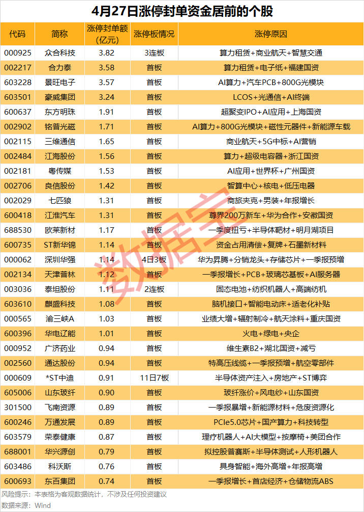 从封单力度(封单量占流通A股比例)来看,众合科技、ST新华锦、欧莱新材等力度较大,分别为5.61%、3.78%、3.74%。