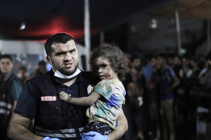 当地时间2023年10月29日,加沙地带,当地遭以色列袭击后,福利视频导航受伤的儿童被送往医院治疗。IC photo 图